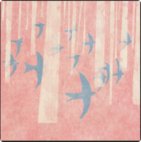作品以粉色为基调,搭配白色竖条纹,营造出柔和的视觉氛围。蓝色飞鸟在其中自由穿梭,展现出灵动与生机,整体给人一种宁静又充满活力的感觉。