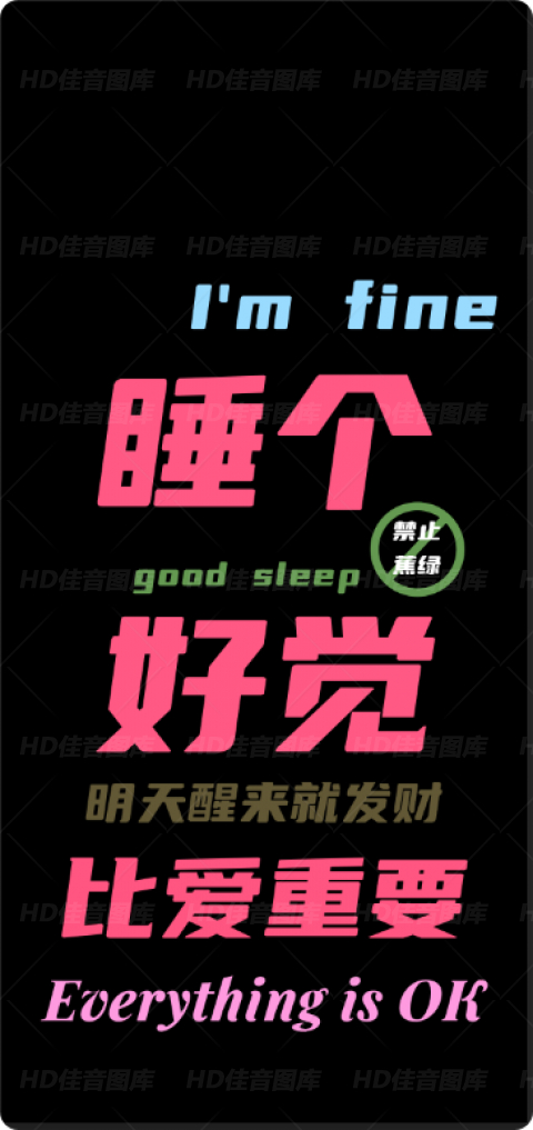 这幅设计以黑色为底,通过撞色字体排布传递情绪张力:荧光粉 “睡个好觉” 与 “比爱重要” 形成视觉焦点,搭配中英文短句与绿色 “禁止焦虑” 印章,用直白文案与强对比色彩表达当代年轻人的自我关怀态度。