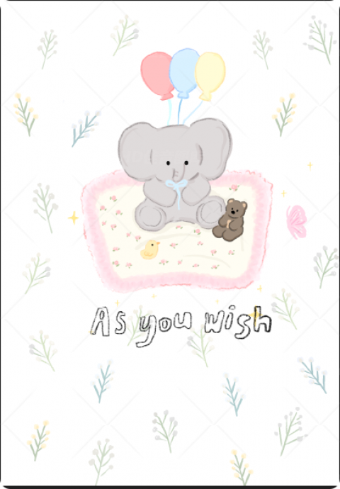 这幅插画以柔和的水彩风格营造温馨氛围,主体是一只抱着小熊玩偶的灰色小象,坐在粉色花边垫子上,头顶漂浮着彩色气球,周围点缀着淡雅的植物线条和星星光斑,底部 “As you wish” 手写体文字传递出童真与美好的祝愿。