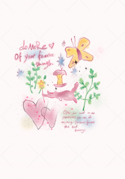 这幅水彩风格插画以柔和粉彩色调为基底,通过手写英文短句 “do more of your favorite things” 传递积极生活态度,画面融合蝴蝶、星星、爱心等梦幻元素,搭配漂浮的猫咪、苹果与香草植物,用晕染笔触与斑驳肌理营造轻盈治愈的氛围,右下角手写体寄语增添私密感与温度。