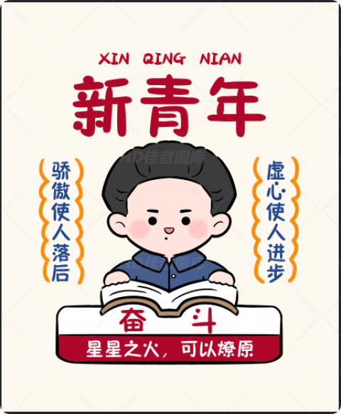 这幅插画以 “新青年” 为主题,采用卡通风格塑造青年形象,身着蓝色衬衫专注读书,书本上 “奋斗” 二字点明核心。左右两侧 “骄傲使人落后”“虚心使人进步” 的标语形成对仗,底部 “星星之火,可以燎原” 传递励志精神,整体通过红色主调与简洁线条,融合传统箴言与现代审美元素