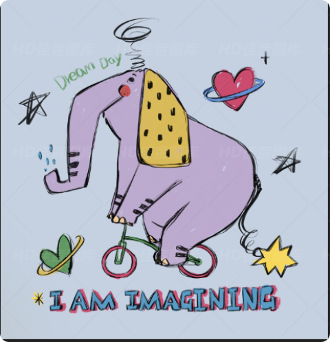 这幅儿童涂鸦风格插画中,紫色大象骑着绿色自行车,黄色斑点耳朵搭配红脸颊,背景点缀星星、爱心与 “Dream Day”“I AM IMAGINING” 文字,线条稚拙充满童真幻想。