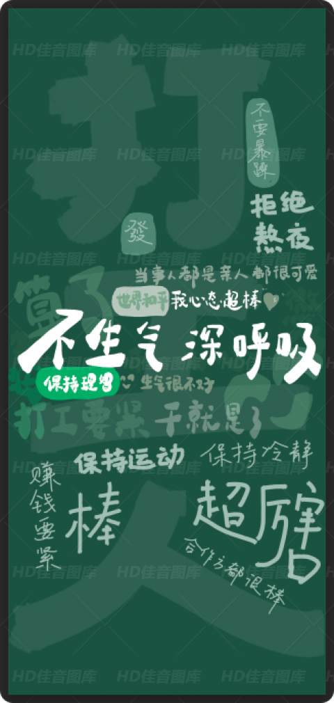这幅插画以深绿色为背景,上面布满了各种手写风格的文字,像 “不生气 深呼吸”“保持冷静”“拒绝熬夜” 等,还有 “发” 字印章和 “超赞” 这样的文字,整体风格很有个性,充满了积极的生活态度。