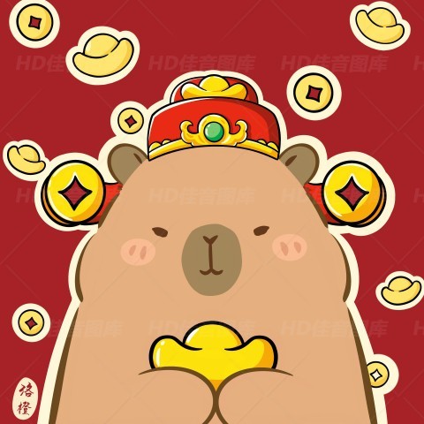 这幅插画以红色为背景,中央是戴着财神帽、手持金元宝的卡通小熊形象,周围环绕金色铜钱和元宝装饰,右下角有 “格格” 印章,整体呈现喜庆的招财主题风格。