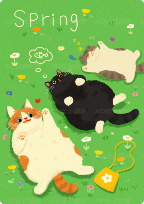 这幅插画以绿色草地为背景,上面有三只可爱的猫咪在打滚玩耍,旁边还有小花、黄色包包等元素,左上角写着 “Spring” 字样,整体充满了春天的气息和温馨的氛围。